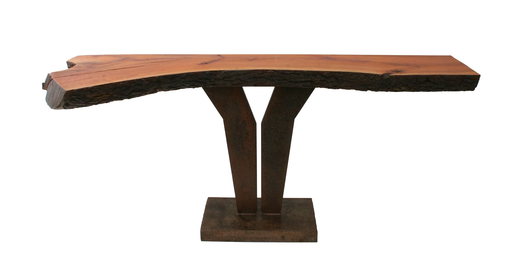 A warm orange-amber tone glows across the incredible grain structure on the live-edge limb transition of this beautiful 3.5" cherry slab. Supported by a custom fabricated pedestal made from decades-old, rust pitted, reclaimed structural steel, this one of a kind console table is statement piece for any foyer or grand hallway and has a durable finish capable of withstanding a raging cocktail party.